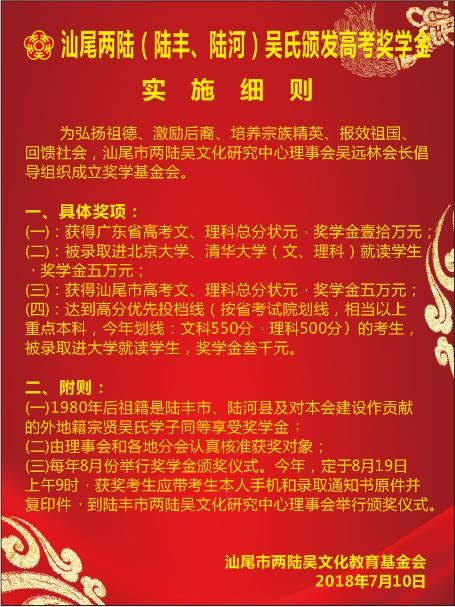 2018年8月19日,廣東兩陸(陸豐、陸河)吳文化研究會在兩陸會館大廈舉行了2018年高考獎學(xué)金頒獎大會!