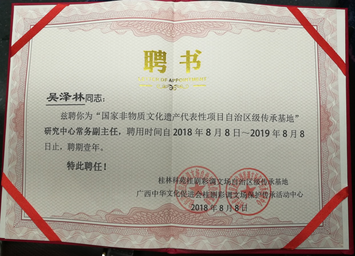 廣西吳氏宗親總會(huì)常務(wù)副會(huì)長(zhǎng)、深圳吳君子藝術(shù)館吳澤林宗長(zhǎng),被桂林科苑桂劇彩調(diào)文場(chǎng)自治區(qū)級(jí)傳承基地、廣西中華文化促進(jìn)會(huì)桂劇彩調(diào)文場(chǎng)保護(hù)傳承活動(dòng)中心聘為國(guó)家非物質(zhì)文化遺產(chǎn)項(xiàng)目自治區(qū)級(jí)傳承基地研究中心常務(wù)副主任。