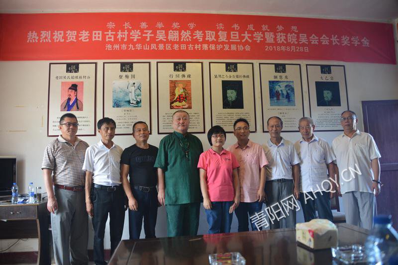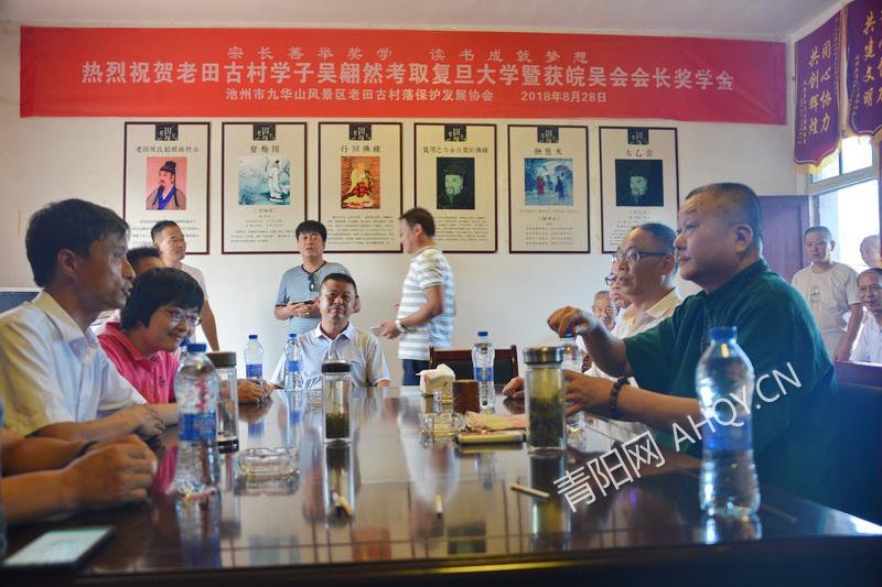 8月28日上午10時許,吳峰董事長一行抵達九華山風景區(qū)老田村吳氏宗祠,與學子吳翩然及其家長,老田村村支兩委,老田吳氏協(xié)會會長、等進行座談就老田吳氏的過去,及今后的發(fā)展進行了探討,期間吳峰董事長對吳翩然同學的獲得如此優(yōu)異的成績給予表彰和鼓勵,并頒發(fā)1萬元吳會會長獎學金,告誡吳同學努力學習,將來走上社會報效祖國,把老田乃至吳氏的慈善事業(yè)發(fā)揚光大。