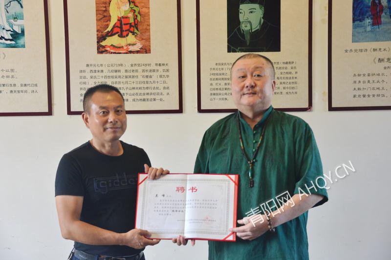 座談會后九華山風景區(qū)老田吳氏協(xié)會會長、老田村黨支部書記向吳峰董事長頒發(fā)了老田吳氏協(xié)會終身名譽會長聘書。