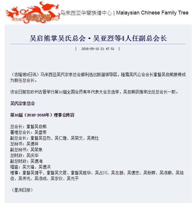 馬來(lái)西亞《星洲日?qǐng)?bào)》2016年5月9日吉隆坡訊:吳啟熊掌吳氏總會(huì)·吳亞烈等4人任副總會(huì)長(zhǎng)