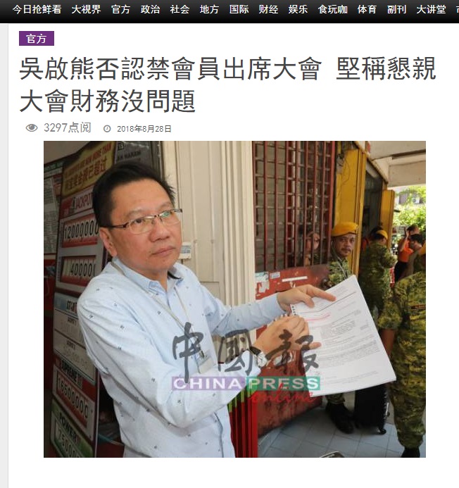 另一名原任副總會(huì)長(zhǎng)拿督吳亞烈也直言,吳啟熊在處理賬目時(shí)手法不清且毫不透明,如今還無(wú)理拒絕他們參與會(huì)員大會(huì),相信吳啟熊等人只是要通過(guò)大會(huì)批淮財(cái)務(wù)報(bào)告。
