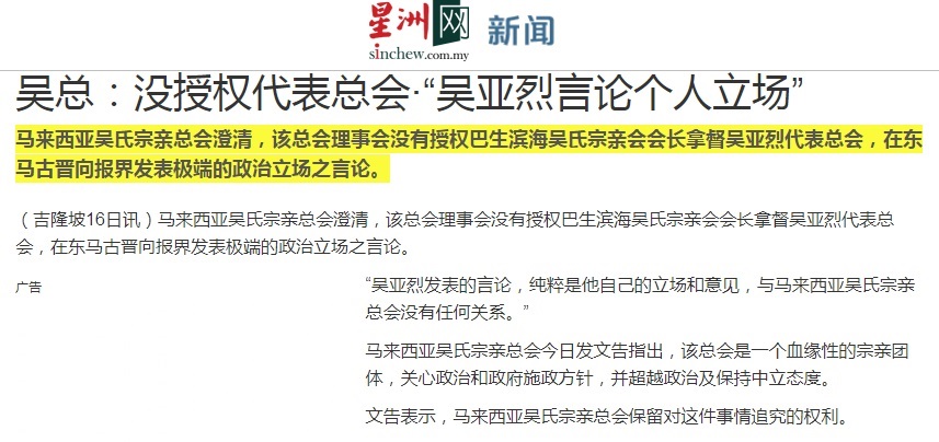 馬來(lái)西亞吳氏宗親總會(huì)今曰發(fā)文告指出,該總會(huì)是一個(gè)血緣性的宗親團(tuán)體,關(guān)心政治和政府施政方針,并超越政治及保持中立態(tài)度。文告表示,馬來(lái)西亞吳氏宗親總會(huì)保留對(duì)這件事情追究的權(quán)利。