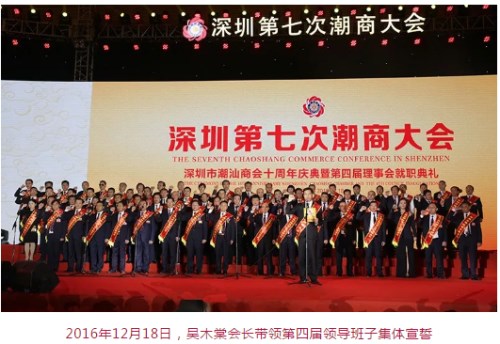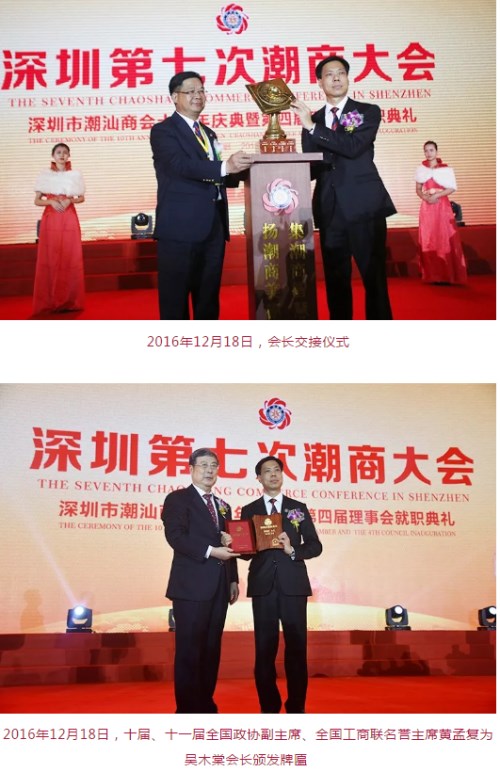 2016年12月18日,舉行了深圳第七次潮商大會(huì)、深圳市潮汕商會(huì)十周年慶典暨第四屆理(監(jiān))事會(huì)就職典禮,邀請(qǐng)了國(guó)家、省、市各級(jí)領(lǐng)導(dǎo)、港澳臺(tái)以及25個(gè)國(guó)家、146個(gè)潮屬社團(tuán)的潮人精英及商會(huì)會(huì)員共2000多人共襄盛會(huì)。吳木棠接過(guò)深圳市潮汕商會(huì)紅頭船掌舵,十屆、十一屆全國(guó)政協(xié)副主席、全國(guó)工商聯(lián)名譽(yù)主席黃孟復(fù)為他頒發(fā)牌匾,開啟了新的掌舵人征程。