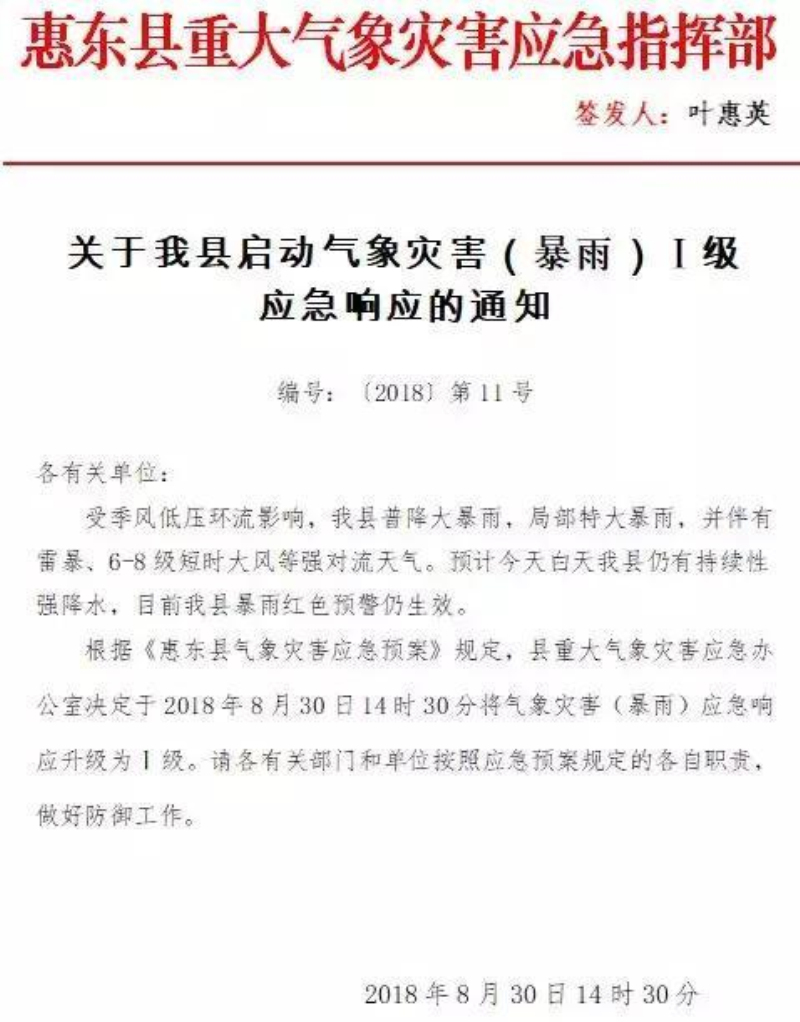 8月27日,廣東惠州惠東縣普降大暴雨,局部地區(qū)特大暴雨,暴雨持續(xù)四天,郊區(qū)有些地方出現(xiàn)山體滑坡,城區(qū)有些路段嚴(yán)重積水,交通中斷,受強(qiáng)降雨影響,白盆珠水庫水位持續(xù)上漲,當(dāng)時(shí)的水位已達(dá)76.92米,超過了76米汛限水位。8月31日,為確保水庫安全,根據(jù)惠州市三防指揮部《關(guān)于開閘泄洪的令》(惠防令[2018]1號(hào)),定于8月31日上午8時(shí)40分開閘泄洪,下泄流量不超過300立方米/秒。白盆珠水庫位于惠東白花鎮(zhèn)四十多公里處的西枝江上游。泄洪12個(gè)小時(shí)后,白盆珠水庫泄洪的洪水到達(dá)白花鎮(zhèn)。