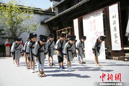 中新網(wǎng)湖州8月31日電(胡豐盛 李鳳姣 歐陽(yáng)愛(ài)瓊 張卉)正衣冠、作揖叩首行拜師禮、輕點(diǎn)朱砂啟智、開(kāi)筆破蒙、寫下人字……近日,伴著古雅的樂(lè)聲,在晚清民國(guó)時(shí)期著名國(guó)畫家、書法家、篆刻家吳昌碩故里——浙江省安吉縣鄣吳鎮(zhèn),幾十名即將上小學(xué)的學(xué)童完成開(kāi)筆啟蒙禮。