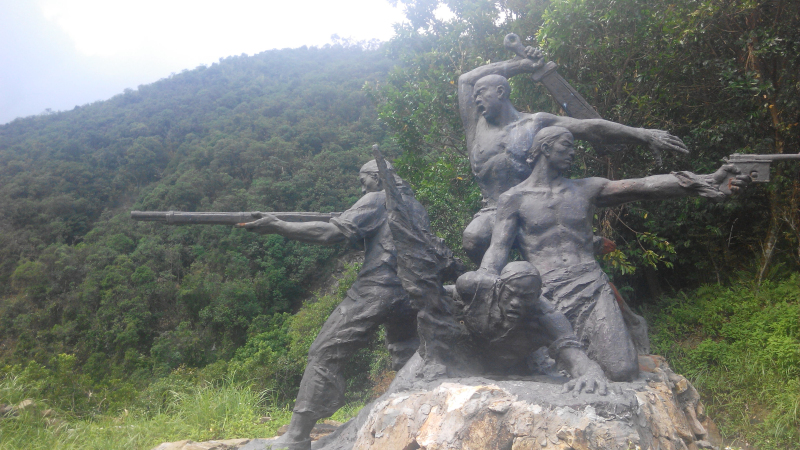 從“第一槍”這里往上還有路,不過我覺得這上面應(yīng)該沒有雕塑了,因為這第一槍,應(yīng)該是在雕塑園的最高處才是,所以就繼續(xù)向前走,看到的是“練兵試槍”的群雕,不過我注意到這個雕塑里,起義軍士兵頭上沒留辮子,不知道是不是在清朝的時候,客家人不留辮子,還是參加起義后,起義軍就剪了辮子。再往前走是運送槍支彈藥等軍火的雕塑。三洲田這里離海邊(也就是現(xiàn)在深圳的大小梅沙)只有十里,很近,所以孫中山選擇在這里起義,從海路運軍火進來很方便。