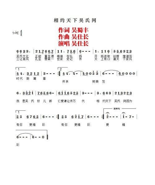 現(xiàn)將由本人作詞、吳仕長(zhǎng)譜曲并演唱、40多種樂器伴奏的《相約天下吳氏網(wǎng)》主題歌作為成立一周年獻(xiàn)禮與大家分享。同時(shí)感謝吳仕長(zhǎng)宗賢無(wú)私奉獻(xiàn)為《相約天下吳氏網(wǎng)》主題歌譜曲并演唱。