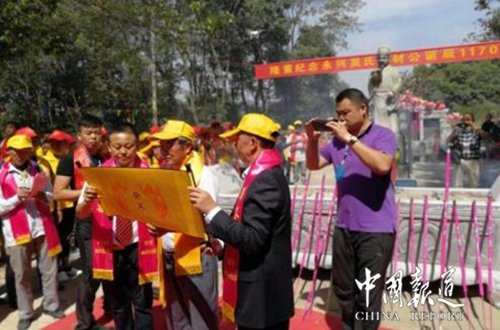 10月2日上午,2018湖北吳文化節(jié)暨良材公誕辰1170周年慶典在陽新縣城萬春公園隆重舉行。上午8時(shí),來自全國10多個(gè)省市及陽新當(dāng)?shù)氐淖谟H代表3000多人陸續(xù)進(jìn)入會(huì)場(chǎng)。11時(shí),陽新永興吳氏至德文化發(fā)展有限公司吳風(fēng)翔會(huì)長宣布慶典開始。會(huì)上,宣讀了各地的賀電,二屆世吳主席吳良民、省會(huì)吳合林會(huì)長、以及各地來賓代表分別致辭。大會(huì)還對(duì)吳氏文化研究中做出突出貢獻(xiàn)的32位宗親頒發(fā)了特別貢獻(xiàn)獎(jiǎng)。緊接著,在萬春公園良材公墓地對(duì)良材公冥誕1170周年舉行莊重的祭祀儀式。