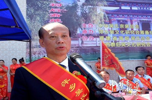 中華吳氏宗親總會主席吳文富發(fā)表熱情洋致辭,吳文富在辭中說,在歡度中秋、國慶“雙節(jié)”的喜慶日子里,我們相聚在“全國最美縣域”蘆溪縣,召開中華吳氏第十一屆懇親大會暨海峽兩岸經(jīng)貿(mào)論壇;值此美好時刻,我謹代表主辦單位——中華吳氏宗親總會及泉州吳氏大宗祠管委會、晉江市吳文化研究會,向出席本次大會的各位領(lǐng)導(dǎo)、各界朋友們表示熱烈的歡迎和衷心和感謝!向本次大會的承辦單位——中華吳氏宗親總會萍鄉(xiāng)分會、萍鄉(xiāng)泰伯企業(yè)商會全體宗親致以親切的問候!