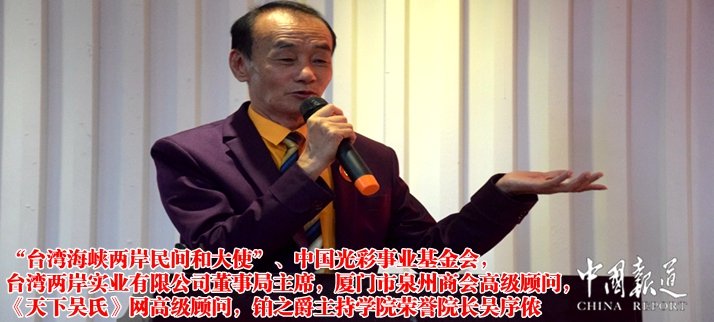 中華吳氏宗親總會(huì)主席吳文富在致辭中,金風(fēng)送爽,丹桂飄香。在歡度中秋、國(guó)慶“雙節(jié)”的美好日子里,在歡慶中華吳氏第十一屆懇親大會(huì)圓滿閉幕的喜慶日子里,我們?cè)谶@里隆重舉行宜春泰伯商會(huì)揭牌儀式。借此機(jī)會(huì),我謹(jǐn)代表中華吳氏宗親總會(huì)、泉州市吳氏大宗祠管委會(huì)、晉江市吳文化研究會(huì)表示熱烈祝賀!向新當(dāng)選的宜春泰伯商會(huì)領(lǐng)導(dǎo)班子致以熱烈的祝賀!向光臨大會(huì)的各位宗親,向長(zhǎng)期關(guān)心、支持吳氏宗親事業(yè)的各位朋友、各界人士致以衷心的感謝!