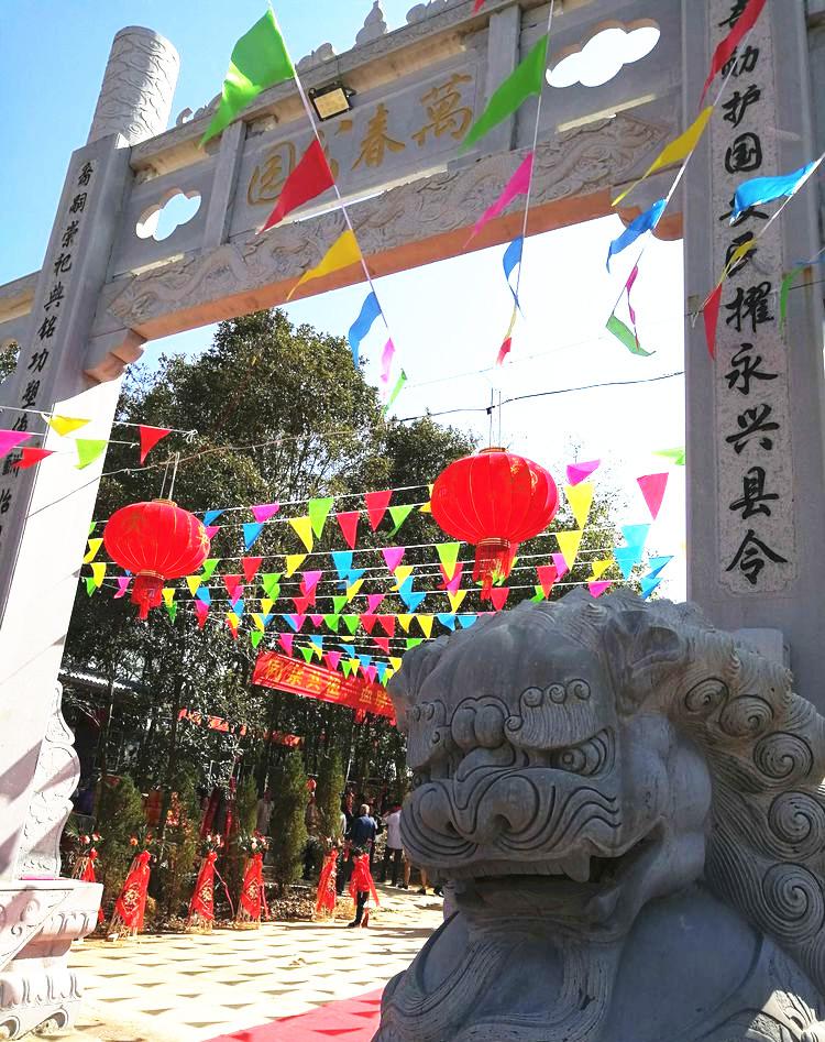 11時30分,與會的吳氏宗親3000余人懷著崇敬的心情列隊前往良材公墓園,只見一座高大的花崗巖石牌坊巍然屹立,牌坊正中上書四個金色大字“萬春公園”,石柱左右篆刻了一副楹聯(lián),上聯(lián)是“良材建奇勛護國安民擢永興縣令” ,下聯(lián)是“裔嗣崇祀典銘功塑像酬始祖遺恩”。青松高聳,綠樹掩映,永興始祖良材公和夫人上官氏的墓冢悄然靜臥。瞻仰先祖的墓冢和塑像,一種尊祖敬宗之心不禁令人油然而生。