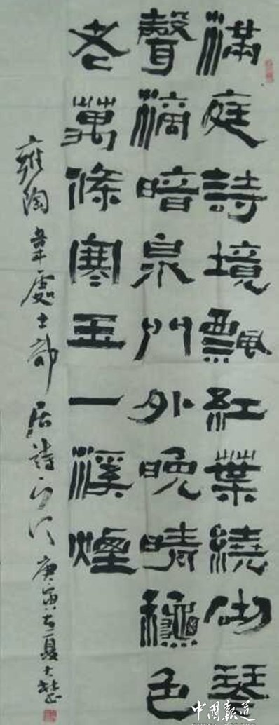 2018年1月1日由人民日?qǐng)?bào)網(wǎng)推薦,又被北京(2017年度驕傲人物評(píng)委會(huì))特授予“2017驕傲年度人物稱號(hào)”!2018年2月4日參加北京首屆書法春晚,現(xiàn)場(chǎng)奉獻(xiàn)墨寶《家和萬事興》懸空書法真功夫,以漢簡(jiǎn)隸多種書法于一體,技?jí)喝悍紭s獲2018中國(guó)首屆書法春晚十大書法家金獎(jiǎng)!