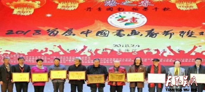 2018年2月4日參加北京首屆書法春晚,現(xiàn)場(chǎng)奉獻(xiàn)墨寶《家和萬(wàn)事興》懸空書法真功夫,以漢簡(jiǎn)隸多種書法于一體,技?jí)喝悍紭s獲2018中國(guó)首屆書法春晚十大書法家金獎(jiǎng)!
