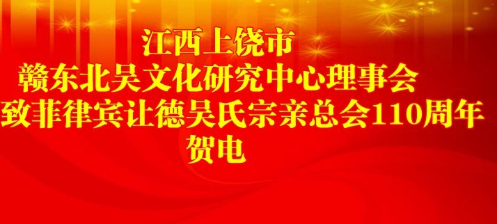 欣聞菲律賓讓德吳氏宗親總會110周年慶典,中國江西省上饒市贛東北吳文化研究中心理事會表示熱烈的祝賀!帶著我們虔誠之心向菲律賓全體宗親問好!祝福參加慶典的全體宗親吉祥如意!