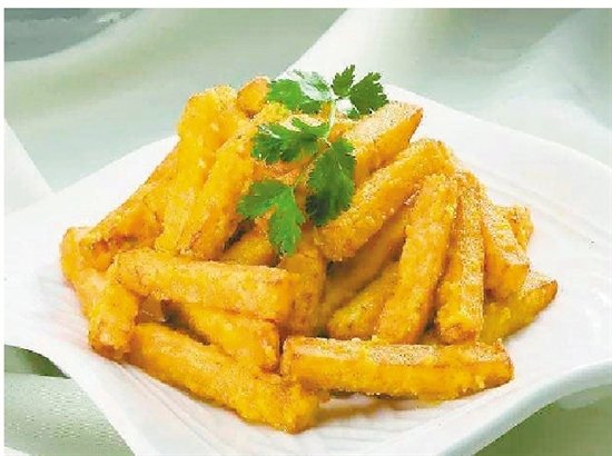 (2)炒鍋上火,放入花生油燒至五成熱,把腌好的南瓜條逐條沾上蛋糊,放入油鍋內(nèi)炸成淡黃色,撈出瀝油。炒鍋復(fù)上火,鍋內(nèi)留少許油,放入蔥末、姜末炸出香味,倒入南瓜條拌和均勻,放入胡椒粉、五香粉拌勻,裝盤即成。