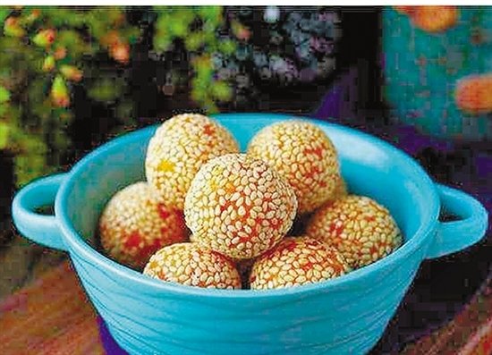 (3)將面團(tuán)分成大小均勻的面劑子,搓圓后放到芝麻里面來(lái)回滾幾下,直到面劑子都均勻地裹上芝麻;