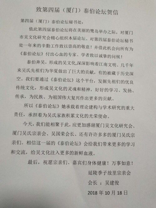 由廈門吳文化研究會主辦的《第四屆泰伯論壇》即將在美麗的鷺島舉行,一場舉世矚目的文化盛宴即將開啟。在此,我衷心祝愿大會圓滿成功。