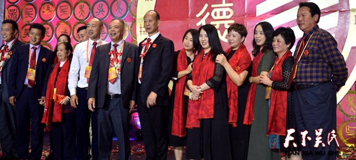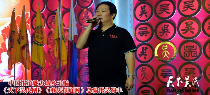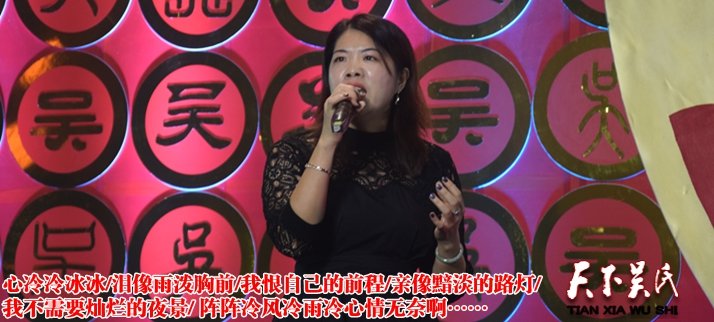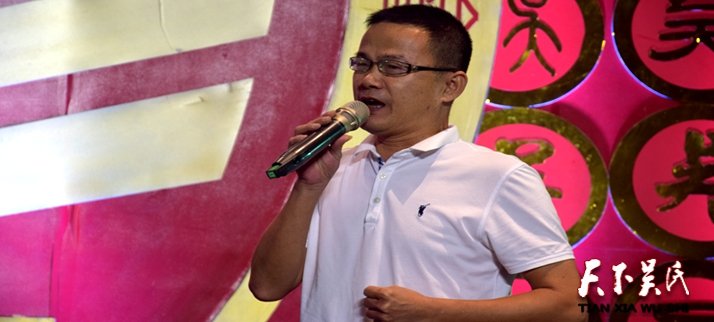 天下吳氏網(wǎng)總編吳蜀豐上臺演唱自己創(chuàng)作的歌曲《相約天下吳氏》網(wǎng),聲情并茂歡快明朗的旋律迎來潮水般的掌聲?!断嗉s天下吳氏網(wǎng)》一周年主題歌〔2017年10-2018年10〕作詞∶吳蜀豐作曲∶吳仕長,演唱∶吳仕長,“吳氏文化正能量,至德精神在弘揚(yáng)。開拓進(jìn)取創(chuàng)輝煌,譜寫時(shí)代新篇章。三讓高風(fēng)孔圣贊,第一世家史記傳。天上有口遍天下,家風(fēng)傳承樹典范。我是吳氏好兒郎,仁愛謙讓傳萬代。相約天下吳氏網(wǎng),因?yàn)橛心愀剩?rdquo;