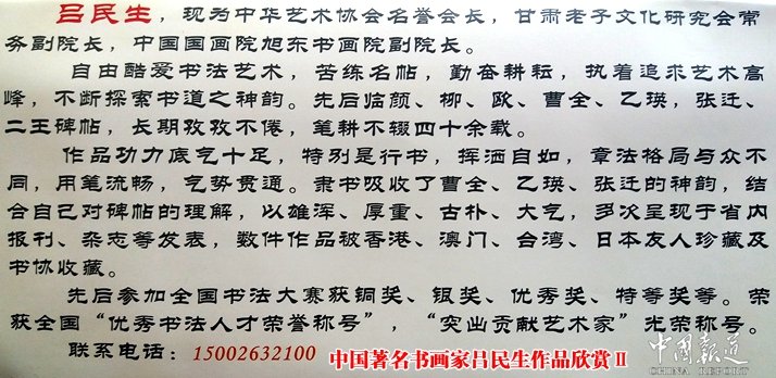 呂民生,現(xiàn)為中國(guó)觀網(wǎng)一帶一路書畫院常務(wù)副院長(zhǎng)、中華藝術(shù)協(xié)會(huì)名譽(yù)會(huì)長(zhǎng),甘肅老子文化研究會(huì)常務(wù)副院長(zhǎng),中國(guó)國(guó)畫院旭東書畫院副院長(zhǎng),中國(guó)官網(wǎng)網(wǎng)民西部書畫大家影響力人物,浙江藝道網(wǎng)絡(luò)科技有限公司藝術(shù)家簽約藝人。