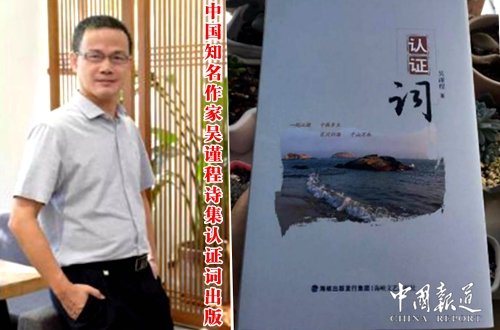 中國報道訊(吳蜀豐福建晉江報道)日前,晉江詩人吳謹(jǐn)程的詩歌作品集《認(rèn)證詞》由海峽文藝出版社出版。這部作品集從詩人近幾年創(chuàng)作的數(shù)百首詩歌作品中選編150首,以“認(rèn)證詞”命名,詩人、詩評家盧輝、蔡芳本、曉川為之撰評,石獅日報茅羅平總編為之掌鏡。