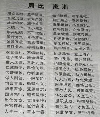 重慶市永川區(qū)鄧家坳周氏(尚書(shū)公后裔)字輩:尚夢(mèng)應(yīng)康世,孫宗道仕友,子均仲忠萬(wàn),以自時(shí)大章,華先維繼述,裕后樂(lè)英賢。秩序本天定,彝倫在人全,謨烈由今紹,奕葉譜相傳,家乘恪遵守,祥發(fā)永綿延。重慶市萬(wàn)州區(qū)(四川彭州回民后裔)周氏字輩:文天國(guó)應(yīng)全,忠孝乃成先,卓善(尚)方為寶,事業(yè)樂(lè)康年。廣東普邑周氏字輩:開(kāi)基宏遠(yuǎn)猷,篤慶光前悠,孝友承先德,萃宗衍范疇,合家宜睦順,守理重經(jīng)修,奕世永繩武,千秋恒作裘。廣東河源周氏字輩:汝南昭穆序,作述發(fā)其祥,奕世聲名煥,傳家福慶長(zhǎng),恩明聯(lián)統(tǒng)紀(jì),誼美植綱常,允克紹先烈,萬(wàn)年迪吉康。廣東潮陽(yáng)泗水周氏字輩:多士敬宏毓,英資衍芳緒,勤修昭厚德,翊贊耀明良,攸子崇伯欽,淑憲紹懿徽,植本宗永健,嗣典運(yùn)開(kāi)祥。