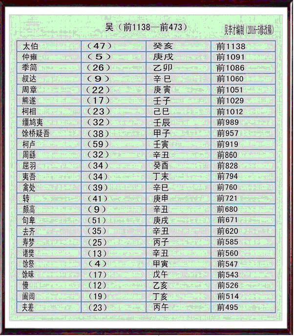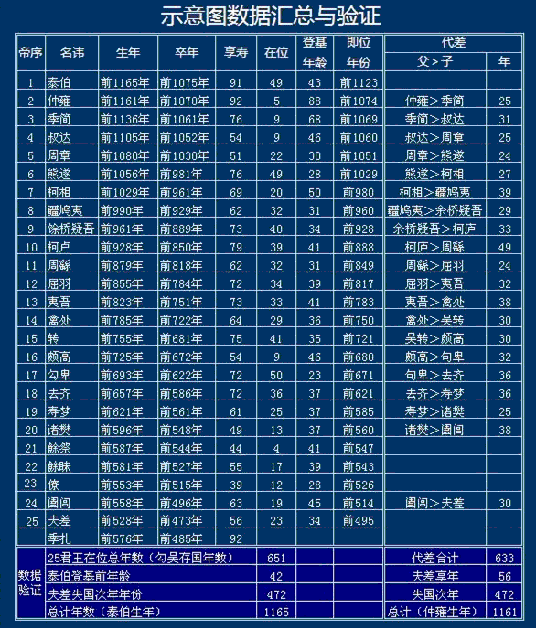 這里不再詳細討論,該圖表中,從仲雍開始的即位年份應(yīng)該向前推前一年,例如,將仲雍的即位年份由公元前1091年改為公元前1092年(即泰伯的卒年),余以此類推。