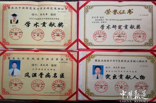 吳風平先生的個人事跡被錄入《世界名醫(yī)大典》、《中國中醫(yī)名人榜》、《中國優(yōu)秀特色??泼t(yī)薈萃》、《中華各界建設先鋒人物》《世紀風采人物》等大型權威辭書。