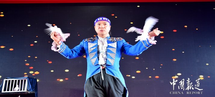 時尚激情的爵士舞《抖音串燒》。來自蒼南太姥山鎮(zhèn)畬族魔術(shù)表演藝術(shù)家藍(lán)林表演的《夢幻白鴿》。令人拍案叫絕迎得全場群眾的歡呼喝彩。