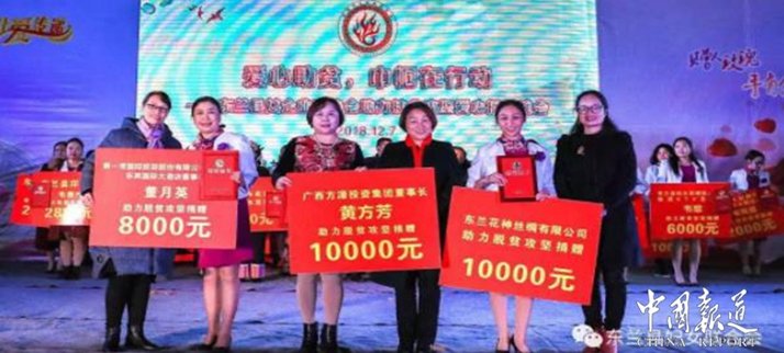 為了慶祝東蘭女企業(yè)家協(xié)會成立,縣婦聯(lián)組織開展“愛心助脫貧,巾幗在行動”東蘭縣女企業(yè)家助力脫貧攻堅愛心慈善晚會,晚會有銅鼓舞《盛世聯(lián)歡》、手語舞〈禮〉、旗袍秀等精彩演出,并在現(xiàn)場開展精準扶貧捐贈活動,東蘭女企業(yè)家紛紛捐款助力脫貧攻堅,現(xiàn)場募捐到11萬余元,廣大非公企業(yè)都在用不同的方式回報社會,履行社會職責,受到廣大人民群眾的好評。