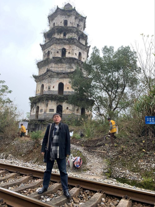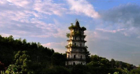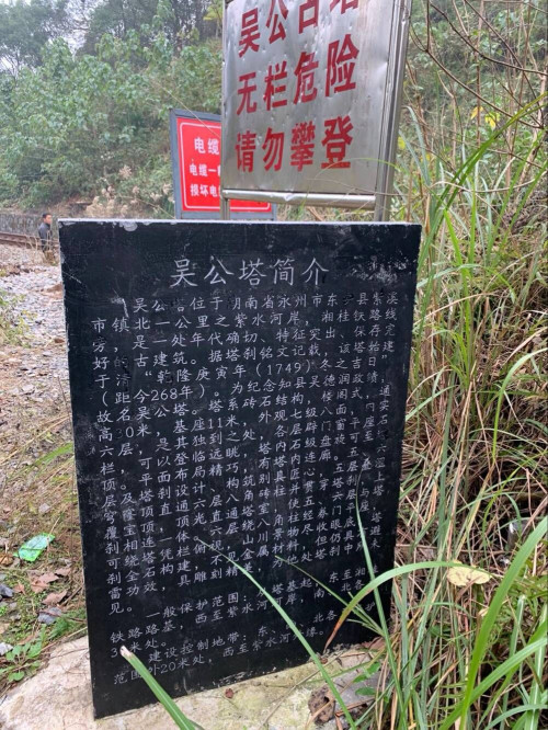 吳公塔位于東安縣紫溪市鎮(zhèn)東側(cè)紫水河畔的玉色懸崖上,對岸有象鼻山和唐帽山,遠觀兩山山貌,峰巒起伏,形似二龍戲水。吳公塔建于清乾隆庚申年(1740)。據(jù)清光緒 《東安縣志》記載:“知縣吳德潤與荊道乾先造浮屠,塔建成后,民眾將此塔以‘吳公’命名,以示紀念。”吳公塔距縣城9公里,湘桂鐵路臥枕塔旁,是東安縣保存比較完整的古跡之一。塔形奇特,青石結(jié)構(gòu),七層八面,高28M,底座直徑11M,一二三四六層均砌有石欄。第五層塔中,有石碑四塊。塔內(nèi)砌有石級,回旋而上,可至塔頂,頂端堆疊有下大上小的石鼓三只,鼓旁砌有石級供游人歇息。人們站立塔頂,極目遠眺,古城雄姿,盡收眼底,俯視奔騰紫水,江心帆影,歷歷在目,風景如畫,令人神往。