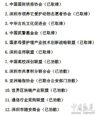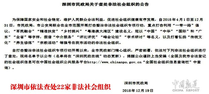 公告原文如下,“為保障國(guó)家安全和社會(huì)穩(wěn)定,維護(hù)人民群眾合法利益,促進(jìn)社會(huì)組織健康有序發(fā)展,自2018年4月1日至12月31日,市民政局、市公安局聯(lián)合在全市范圍開展打擊整治非法社會(huì)組織專項(xiàng)行動(dòng),重點(diǎn)打擊利用“一帶一路”倡議、“軍民融合”“精準(zhǔn)扶貧”“鄉(xiāng)村振興”“粵港澳大灣區(qū)”建設(shè)名義,冠以“中國(guó)”“中華”“國(guó)際”和“廣東”“全省”等字樣,假借“中介服務(wù)”“評(píng)比評(píng)優(yōu)”“峰會(huì)論壇”“學(xué)術(shù)研討”等名義,以及打著弘揚(yáng)“傳統(tǒng)文化”“養(yǎng)生修煉”“宗教活動(dòng)”等旗號(hào)在我市活動(dòng)的非法社會(huì)組織。自打擊整治非法社會(huì)組織專項(xiàng)行動(dòng)開展以來,全市民政部門精心組織,嚴(yán)密部署,依法對(duì)下列非法社會(huì)組織進(jìn)行了查處,現(xiàn)將名單予以公布(名單將在“深圳民政在線”動(dòng)態(tài)更新),提醒公眾謹(jǐn)防上當(dāng)受騙(全國(guó)及我市合法登記的社會(huì)組織信息可在中國(guó)社會(huì)組織公共服務(wù)平臺(tái)http://www.chinanpo.gov.cn“全國(guó)社會(huì)組織信息查詢欄”中查詢)。”深圳市民政局 2018年12月19日。