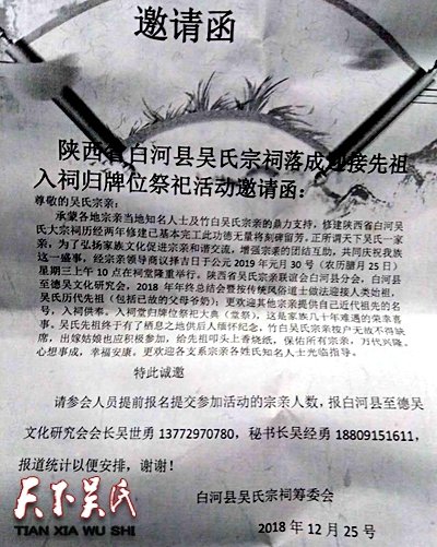 陜西白河縣吳氏宗祠落成邀請(qǐng)函