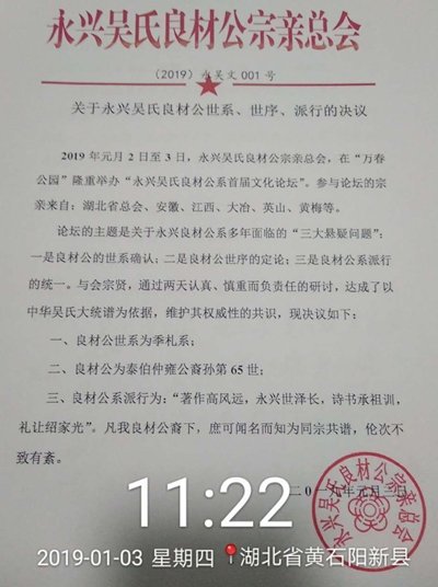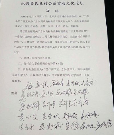今悉知“永興吳氏宗親總會(2019永吳文001號)關(guān)于永興吳氏良材公世系、世序、派行的決議”和“永興吳氏良材公系首屆文化論壇決議”的申明永興吳氏良材公宗親總會論壇大會二十二位代表簽字確認(rèn)、確定將良材公世系定位于季札系,定位太伯65世等決議,深感驚訝!良材公系自首次修譜以來,至今已近千年歷史,都是定位于夫差系,至于是太伯多少世,從古至今都沒有準(zhǔn)確的定性,今貴會極少數(shù)人以無錫譜和《中華吳氏大統(tǒng)宗譜》為依據(jù),在缺少真憑實據(jù)的前提下,舉手表決,私自改變世系的做法有欠嚴(yán)謹(jǐn)!是典型的不負責(zé)任的做法,讓人難以理解!
