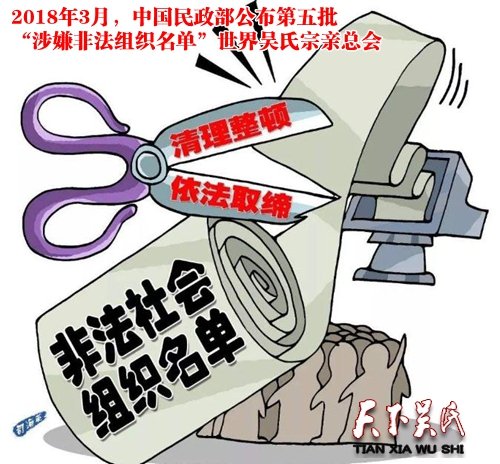 2018年3月,中國民政部公布第五批“涉嫌非法組織名單”,世界吳氏宗親總會赫然在列。從第1-5屆馬來西亞、香港、菲律賓延陵、福建石獅、馬來西亞的世吳大會,都一直是以非法組織開展活動,且不說有什么風險,更重要的是世吳幾屆主席單位漠視政策,不尊重本國與他國的法律法規(guī),不畏懼法網(wǎng),不尊守紀律。世吳的愛國、愛民、愛宗親不是一句空話?這種行徑何談泰伯精神?這是世吳思想特征之四。