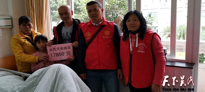 江門市東紅村三組低保戶吳超波兄弟于2018年12月26號(hào)早上突然暈在地上,經(jīng)送往五邑中醫(yī)院檢查后進(jìn)入NICU重癥房,急需要資金幫助;江門禮樂(lè)吳氏(竹野公)宗親聯(lián)誼會(huì)獲知情況后,立即召開各會(huì)長(zhǎng)和理事會(huì)會(huì)議,同意從聯(lián)誼會(huì)基金中資助1000元給低保戶吳超波宗親;中山市吳氏竹野公聯(lián)誼會(huì)知道情況后也捐款1000元給低保戶吳超波宗親;在江門禮樂(lè)吳氏(竹野公)宗親聯(lián)誼會(huì)、廣東珠三角吳氏宗親會(huì)、泰伯基金會(huì)、中山市吳氏竹野公聯(lián)誼會(huì)主要領(lǐng)導(dǎo)吳鎮(zhèn)添、吳占標(biāo)、吳志剛、吳昌祿、吳國(guó)標(biāo)等宗長(zhǎng)的牽頭下,在廣東珠三角吳氏宗親會(huì)常務(wù)副會(huì)長(zhǎng)吳鎮(zhèn)添、吳占標(biāo)的親自組織發(fā)動(dòng)下,宗親們伸出愛(ài)心之手,紛紛捐款,幾天時(shí)間就捐款17850元。