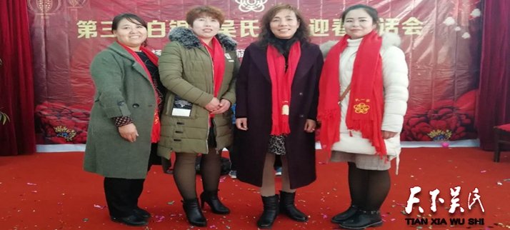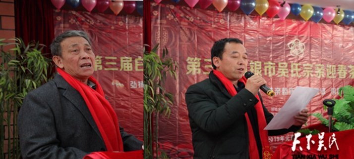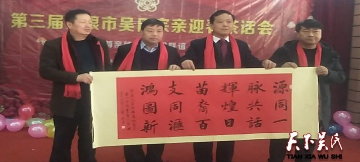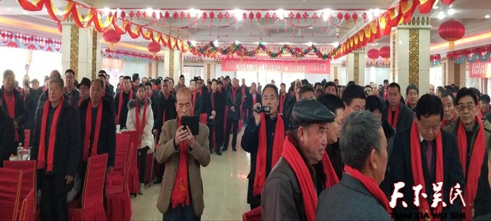 2019年1月6日這一天是農(nóng)歷戊戌年臘月初一,位于西北黃土高原黃河之邊,具有悠久歷史的甘肅靖遠(yuǎn)縣城,寒風(fēng)凜冽,陽光明媚。第三屆白銀市吳氏宗親迎春茶話會在靖遠(yuǎn)縣城烏蘭賓館隆重舉行。大會會場絢麗多彩,喜慶祥和,與會宗親精神飽滿、情意濃濃。會議由靖遠(yuǎn)宗親吳承祖、吳玉淑聯(lián)合主持。上午9時(shí)30分,主持人以激情昂揚(yáng)的開首語正式拉開會議序幕,并在莊重的《國歌》聲和悠揚(yáng)的《吳氏頌歌》中隆重開幕。首先,為表達(dá)對歷代吳氏先祖的敬仰之情,與會宗親向歷代吳氏先祖行默念禮!隨后,本次會議籌備工作組副組長、承辦會議宗親代表吳華致歡迎辭。會上,白銀市吳氏文化研究會(籌)會長,本次會議籌備工作組組長吳有忠做主題講話;白銀市吳氏文化研究會(籌)副會長、景泰縣吳氏宗親會會長吳守存,甘肅條城吳氏家族宗親會副會長吳文貴和會議贊助單位甘肅濱河酒業(yè)銷售有限公司經(jīng)理陳濤分別向大會致辭。為達(dá)到宗親交流,共話吳氏事業(yè),會上參會各地宗親代表吳守春、吳玉君、吳正態(tài)、吳國新、吳秀娟、吳曜辰、吳映璋等宗親圍繞弘揚(yáng)傳承吳氏文化、開展宗誼交流、回顧家族歷史、弘揚(yáng)祖德、踐行孝道等問題進(jìn)行交流發(fā)言,大家談?wù)J識、談體會、共話吳氏未來發(fā)展大計(jì)。大家一致認(rèn)為,組織開展白銀市吳氏宗親聯(lián)誼活動,大力弘揚(yáng)和踐行以吳氏文化為主要內(nèi)容的優(yōu)秀傳統(tǒng)文化,是振興吳氏文化發(fā)展、推動社會文明進(jìn)步的現(xiàn)實(shí)需要,是適應(yīng)新時(shí)代社會發(fā)展潮流的需要。一致表示,要以“不以物喜,不以己悲”和“勿以小善而不為,勿以無利而不做”的思想境界,積極參與宗親活動,加強(qiáng)對吳氏歷史文化的學(xué)習(xí)和研究,增強(qiáng)踐行優(yōu)良傳統(tǒng)主動意識。大家倡導(dǎo)與會宗親要始終以胸懷感恩的向善心態(tài),關(guān)心吳氏事業(yè),注重良好家風(fēng)傳統(tǒng)的營造,積極參與和支持白銀市吳氏文化研究會工作,共同為弘揚(yáng)吳氏文化、傳承至德精神盡心出力,做出自己的貢獻(xiàn)。