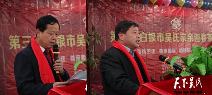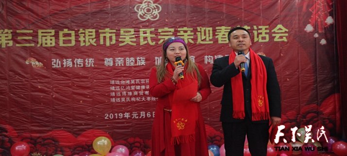 第三屆白銀市吳氏宗親迎春茶話會由白銀市吳氏文化研究會(籌)主辦;靖遠(yuǎn)北灘吳氏宗祠管委會、靖遠(yuǎn)億鴻堂健康調(diào)理中心、靖遠(yuǎn)博緣商貿(mào)有限公司、靖遠(yuǎn)吳氏枸杞大棗經(jīng)營部聯(lián)合承辦。近年來,白銀市吳氏文化研究會(籌)積極響應(yīng)黨和政府弘揚(yáng)中華優(yōu)秀傳統(tǒng)文化號召,動員和團(tuán)結(jié)白銀吳氏宗親著力做好全面復(fù)興中華優(yōu)秀傳統(tǒng)文化,弘揚(yáng)吳氏文化,傳承至德精神各項(xiàng)工作,積極開展弘揚(yáng)祖德、傳承文明、敬老愛幼、尊親睦族、樂善好施、鼓勵獎學(xué)等活動,取得較大的收獲。先后在白銀、景泰兩縣區(qū)成功組織召開了兩屆迎春茶話會,極大地調(diào)動了白銀吳氏宗親參與弘揚(yáng)優(yōu)秀傳統(tǒng)文化的熱情。第三屆白銀市吳氏宗親迎春茶話會在吳華、吳冠金、吳育榮、吳雪、吳玉淑等宗親的積極承辦和各地宗親的踴躍參與下,得到如期勝利召開。當(dāng)天,白銀市轄屬白銀、靖遠(yuǎn)、景泰、會寧、平川各縣區(qū)的近300名吳氏宗親,以飽滿的熱情,懷著美好愿望和期待,不懼嚴(yán)寒,不顧旅途遙遠(yuǎn),從四面八方相約匯聚甘肅靖遠(yuǎn)縣城,以“弘揚(yáng)傳統(tǒng),尊親睦族,加強(qiáng)聯(lián)誼,構(gòu)建和諧”為主題,開展宗親聯(lián)誼,弘揚(yáng)吳氏文化;感受家的溫暖,享受精神的滋潤。用心感受親情,釋放心中的情懷;用愛融化冰雪,努力營造吳氏一家親的濃厚宗誼氛圍。