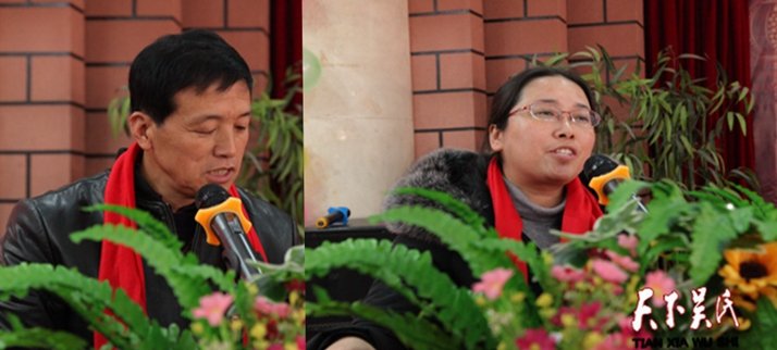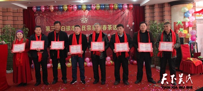 會上,白銀市吳氏文化研究會對近年來關(guān)心支持吳氏事業(yè),為吳氏事業(yè)奉獻(xiàn)愛心、盡心出力,積極承辦歷屆迎春茶話會,做出突出貢獻(xiàn)的宗親進(jìn)行了表彰。白銀市吳氏文化研究會副秘書長吳克田宣讀《白銀市吳氏文化研究會關(guān)于對吳大遠(yuǎn)等10名宗親給予表彰的決定》。白銀市吳氏文化研究會會長吳有忠向受表彰的景泰縣宗親吳大遠(yuǎn)、吳守存、吳守東;白銀區(qū)宗親吳鵬強(qiáng)、吳文和、吳文新;靖遠(yuǎn)縣宗親吳冠金、吳玉淑、吳育榮、吳雪頒發(fā)榮譽(yù)證書。與此同時(shí),會上與會宗親向倡導(dǎo)帶領(lǐng)白銀吳氏弘揚(yáng)傳承吳氏文化、開展宗誼交流的吳有忠會長和保護(hù)先祖歷史文物的靖遠(yuǎn)東灣宗親吳振玉老人進(jìn)行披紅鼓勵,對他們?yōu)閰鞘鲜聵I(yè)所做的貢獻(xiàn)給予充分肯定。部分宗親還以贈送展示吳氏文化精神的書法作品,向《第三屆白銀市吳氏宗親迎春茶話會》的勝利召開表示祝賀。
