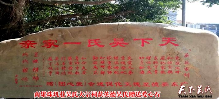 天下吳氏訊(吳文彬 )“吳氏愛心石,贈(zèng)送大宗祠,家風(fēng)傳典范,代代留芳名。”2019年元月28日,濃濃的小年氣氛,英德吳氏愛心志愿團(tuán)五十名代表把吳氏的“愛心石”捐贈(zèng)給南雄珠璣巷吳氏大宗祠門前,給大宗祠門前立下了一面靚麗的風(fēng)景,給全世界的宗親和游客來百家姓宗祠參拜和旅游觀光的人們能看到天下吳氏一家親的濃情誼的愛心石。