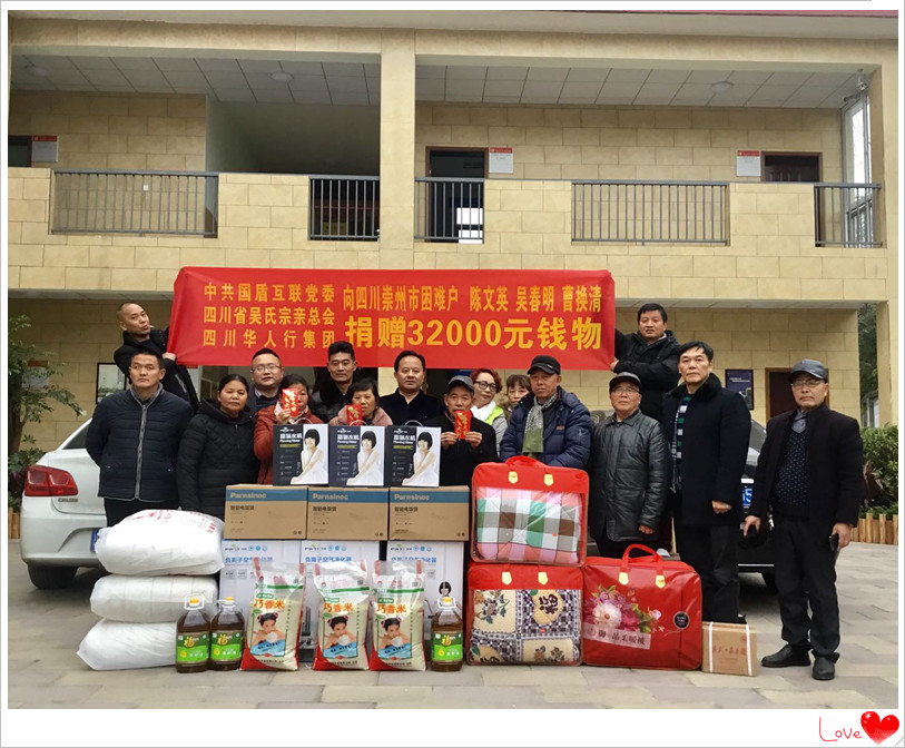下午15時,國盾互聯(lián)西南系統(tǒng)領(lǐng)導(dǎo)人吳天智(四川省吳氏宗親總會會長)姜興華、敖躍新,會同四川省吳氏宗親總會副會長吳金藯(國盾四川吳氏軍團(tuán)負(fù)責(zé)人)、吳新利(中鐵二院教授級高級工程師、國盾四川吳氏軍團(tuán)負(fù)責(zé)人)吳槽吳氏宗親會會長吳孟秋(國盾四川吳氏軍團(tuán)吳槽團(tuán)隊負(fù)責(zé)人)等一行13人,來到成都崇州市崇德鄉(xiāng)政府駐地,對該鄉(xiāng)的三位特困戶陳文英、吳春明、曹換清捐贈了32000元的錢物(實際捐贈為現(xiàn)金4200元和價值29000余元的油、米、被子、白酒、空氣凈化器和富氫水素機。