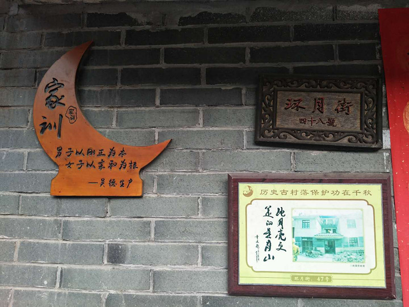 我們漫步在月山村里,呈現(xiàn)給我們的是一幅“小橋流水人家”恬然而優(yōu)美的畫卷。村內(nèi)房屋整潔,排列有序。街道的墻壁上張掛著一排排本村歷代名人的畫像和文字介紹,非常醒目。小溪兩邊的涼亭、景點上都有名人書寫的牌匾、對聯(lián)。滿眼人文鼎盛,世外桃源的景象。這些畫像、文字和對聯(lián)都是吳德生組織搞的,有些對聯(lián)還是吳德生的哥哥吳慶生寫的。