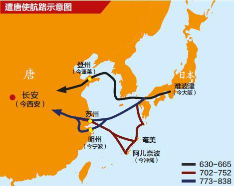 歷史上日本曾經(jīng)十幾次派遣遣唐使由海路來中國學(xué)習(xí),從公元8世紀(jì)70年以后,一直到日本停止遣唐使前,來華航線改取南路,由九州島西邊的五島列島徑向西南,橫渡東海,在長江口的蘇州﹑明州一帶登陸,轉(zhuǎn)由運(yùn)河北上。這條航線所需時(shí)間較短,一般十天左右,甚至三天可達(dá)。