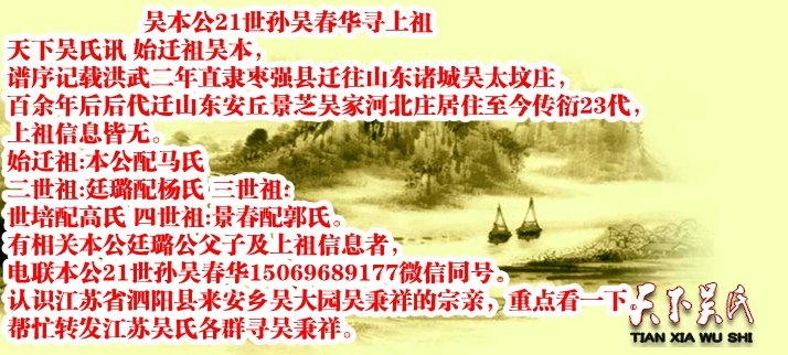 天下吳氏訊 始遷祖吳本,譜序記載洪武二年直隸棗強縣遷往山東諸城吳太墳莊,百余年后后代遷山東安丘景芝吳家河北莊居住至今傳衍23代,上祖信息皆無。