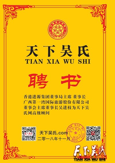 天下吳氏網(wǎng)訊( 吳天下 特約采編 覃源 黃麗桃) 特聘香港進(jìn)源集團(tuán)董事局主席,廣西第一灣國(guó)際旅游股份有限公司董事長(zhǎng)總裁吳進(jìn)枝為天下吳氏網(wǎng)高級(jí)顧問(wèn),吳進(jìn)枝宗長(zhǎng)鼎力支持天下吳氏網(wǎng)傳遞吳氏正能量贊助人民幣20000元。
