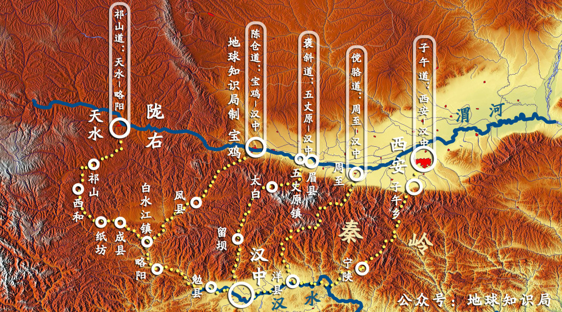 古代從關(guān)中翻越秦嶺到達(dá)漢中,有四條路:子午道、儻駱道、褒斜道、陳倉道。其中子午道上的饒風(fēng)關(guān),是1133年吳玠吳璘抗擊金國軍隊(duì)的饒風(fēng)關(guān)之戰(zhàn)的發(fā)生地。而褒斜道旁,有五丈原(諸葛亮去世的地方)。這四條道路中,褒斜道開發(fā)得最早,據(jù)稱是開辟于史前時(shí)期。