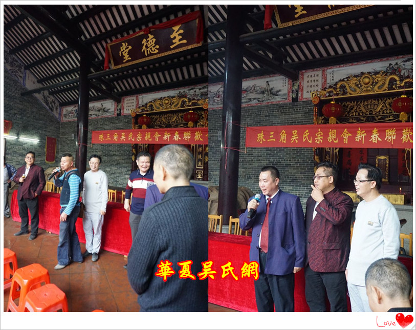參觀麗崗新村完畢后,廣東珠三角吳氏宗親會新春聯(lián)歡會暨珠三角吳氏宗親會領(lǐng)導(dǎo)班子會議在肇慶麗崗村吳氏宗祠進(jìn)行舉行,大會由吳昌祿宗長主持,首先由吳秋良書記作講話,他代表麗崗村對珠三角吳氏宗親前來麗崗新村參觀表示熱烈的歡迎,介紹了麗崗新村新農(nóng)村建設(shè)情況。介紹了麗崗村吳氏宗祠建設(shè)的歷程,秋良書記說:麗崗村吳氏宗祠于2013年興建,麗崗村的村民力經(jīng)艱辛、多方籌集了資金260多萬元興建了現(xiàn)在這座麗崗村吳氏宗祠,成為弘揚(yáng)吳氏家族崇德向善集吳氏名人堂、吳氏來源、吳氏家訓(xùn)、農(nóng)家書屋一體的道德教化和文化教育功能的基地。接著:廣東珠三角吳氏宗親會會長吳錦添通報了參加在江西萍鄉(xiāng)參加中華吳氏第11屆懇親大會的情況,通報了他在中華吳氏第11屆懇親大會上接過了“承辦中華吳氏第12屆懇親大會”的大旗,表示將成立中華吳氏第12屆懇親大會籌備小組,希望珠三角吳氏宗親團(tuán)結(jié)一致,齊心合力,全力做好這次承辦工作,爭取將中華吳氏第12屆懇親大會辦得圓滿成功。最后是,常務(wù)副會長吳建忠、吳占標(biāo)講話。吳占標(biāo)會長講話結(jié)束后,參會的深圳、廣州、東莞、惠州、珠海、江門、中山、肇慶、清遠(yuǎn)、英德、廣西容縣、廣寧、麗崗村吳氏宗親等代表先后進(jìn)行了發(fā)言。