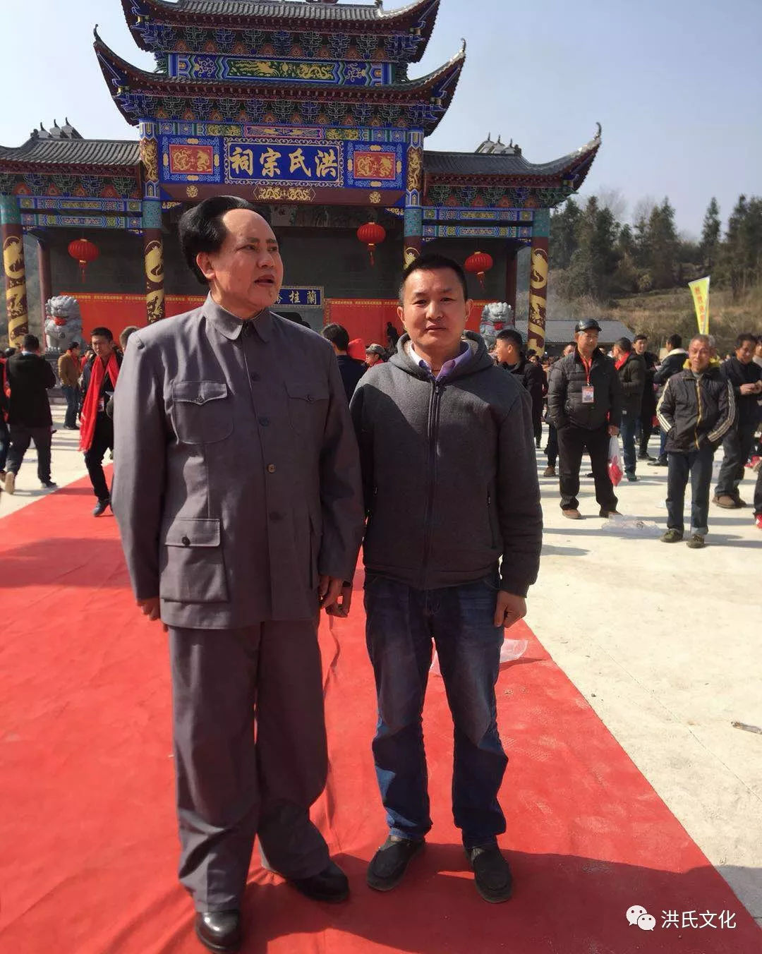 宗祠落成典禮現(xiàn)在也與時俱進(jìn),頗有文化氛圍,除了常規(guī)的鼓樂隊(duì),扮演偉人的特型演員也被請到現(xiàn)場,果然現(xiàn)場嘉賓紛紛把握機(jī)會與演員合影留念。