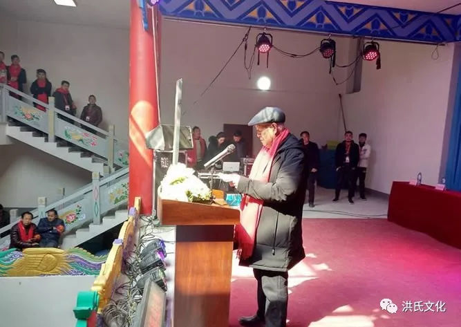 關(guān)于洪姓源流有十一種之多,世易時移,很多歷史無法一一考證。據(jù)《洪氏宗譜》介紹,洪氏始祖系共工氏,是炎帝后裔,后人奉為水神。約至東漢,后裔避仇遷居敦煌,改為洪姓。洪氏一始祖名“普”,生于143年2月1日。洪氏宗譜創(chuàng)修譜序稱“洪氏之先系出姬姓衛(wèi)大夫弘演之后,唐時避高宗子諱,始易洪以為姓。”圖為洪家源洪氏族長在落成典禮上致辭。