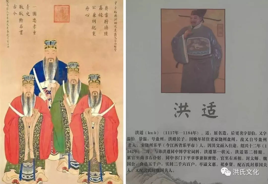 全國各地洪氏宗祠一般懸掛“敦煌世家”的匾額,《郡望百家姓》云:洪氏望出敦煌郡(今甘肅省河西走廊西端)?!缎帐峡悸浴吩疲和鲂?、豫章郡(今南昌、九江一帶),有聯(lián)曰:鄱陽三瑞成連理,豫章四英振家聲。三瑞,出自洪皓,南宋鄱陽人,政和進(jìn)士,建炎年間受命出使金國被扣十五年始終不屈,初官寧海主簿時,功德卓著致縣中荷花、桃、竹皆成連理;而四英出自洪師民,北宋南昌人,其四子明、芻、炎、羽皆以才華著稱,人稱“四英”。